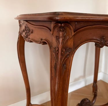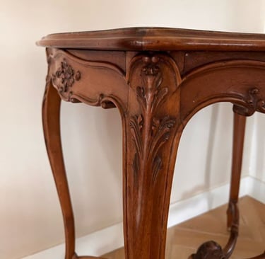 Très jolie table à relooker, avec ses pieds galbés et son entretoise en X ornementée d'une pomme.
