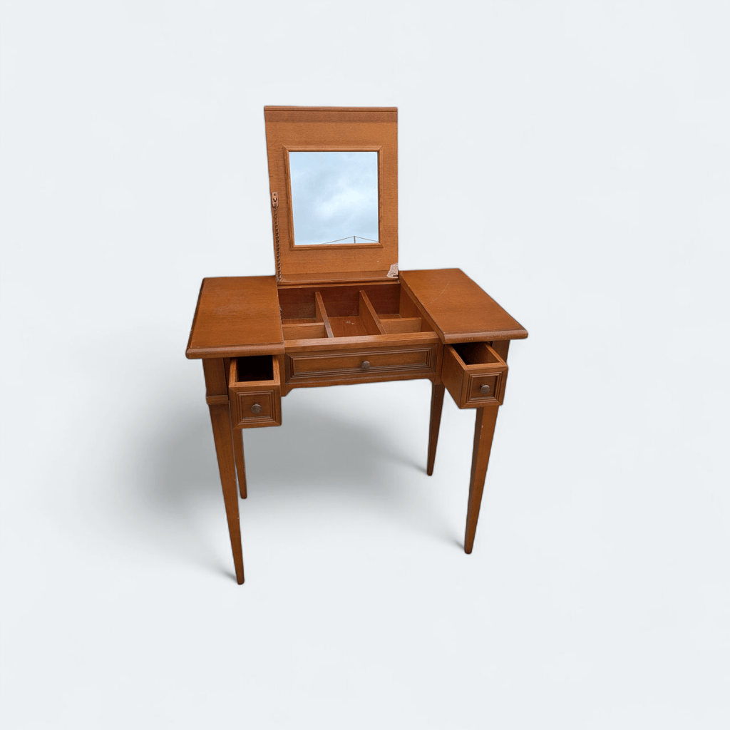 Cette coiffeuse, qui nécessite quelques réparations au niveau de la jonction du miroir à la table, est très pratique avec ses nombreux rangements. Une fois transformée selon vos goûts, elle saura facilement trouver sa place dans votre intérieur.