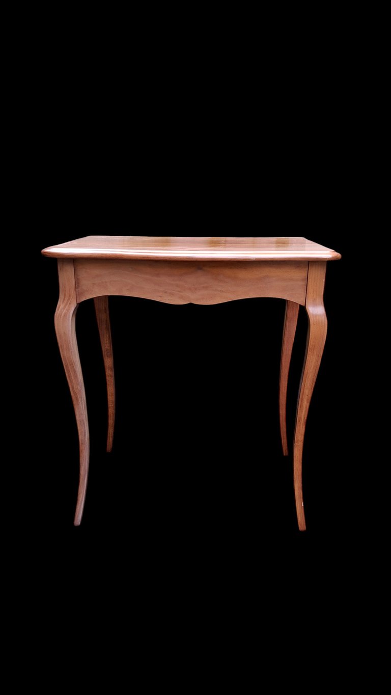 Table d'appoint élégante avec ses pieds galbés. Son tiroir vous offrira la possibilité d'y ranger l'essentiel. Elle est recouverte d'un vernis brillant, qu'il faudra commencer par aérogommer si vous souhaitez retrouver le charme du bois originel. Tout relookage est possible ensuite.